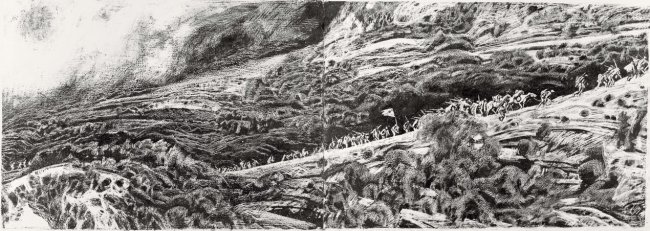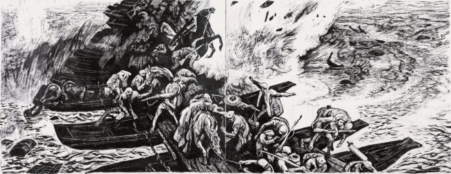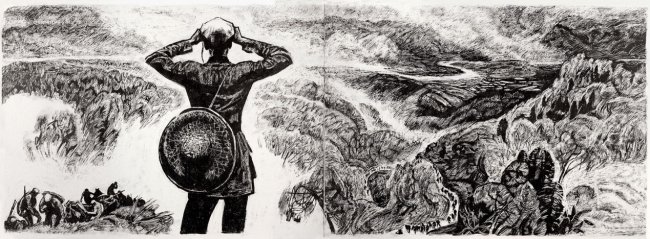 沈尧伊作为我国著名油画家、版画家,一生深耕红色题材创作,尤其对长征历史有着深厚的情感和深入的研究。为了还原长征的真实场景,他曾先后多次重走长征路,踏遍红军走过的山山水水,收集了大量珍贵的历史素材,从人物神态、服饰装备,到山川地貌、民俗风情,都逐一考证、精益求精,只为让每一幅画面都贴合历史、打动人心。展出的作品中,尺寸足有50厘米见方,有的宽度接近1米,这样尺寸不仅让画面有了更多的内容和更深度的刻画,也足以说明说沈尧伊是以创作独幅画创作的态度和精神来创作这部连环画的。