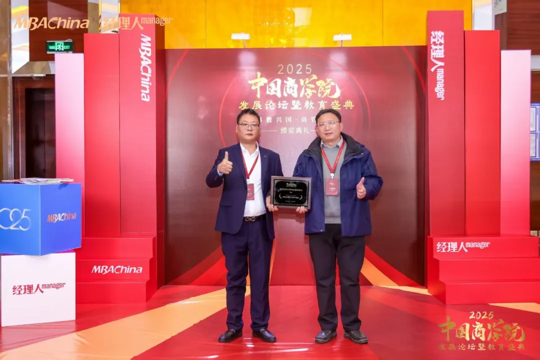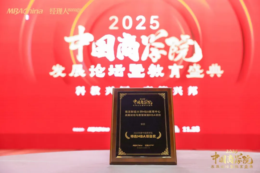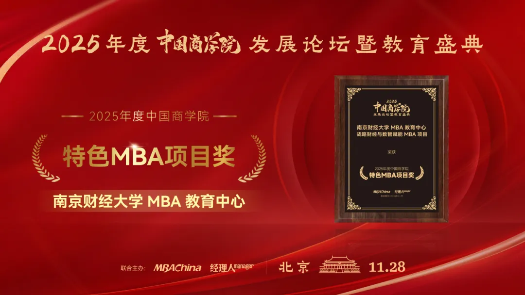 南京财经大学MBA教育中心以全程双元为核心纽带,深度融合校企资源、协同产业实践,荣获“2025年度中国商学院战略财经与数智赋能特色MBA项目”。