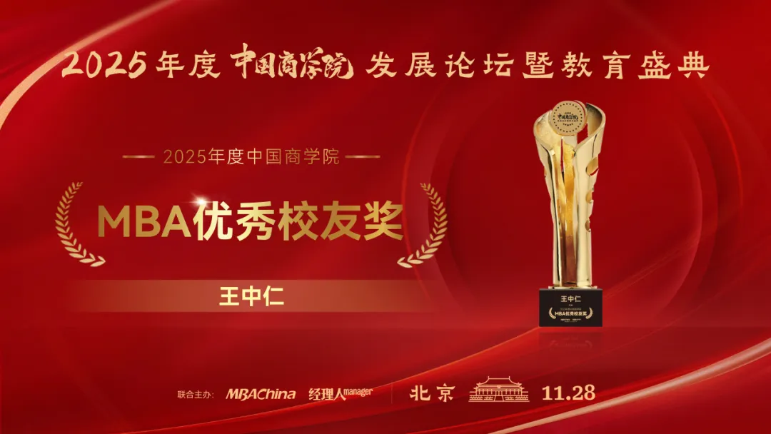 南京财经大学MBA校友王中仁,作为全程双元培养模式的优秀成果代表,凭借卓越的行业实践能力与社会贡献,荣获“2025年度中国商学院MBA项目优秀校友” 奖。